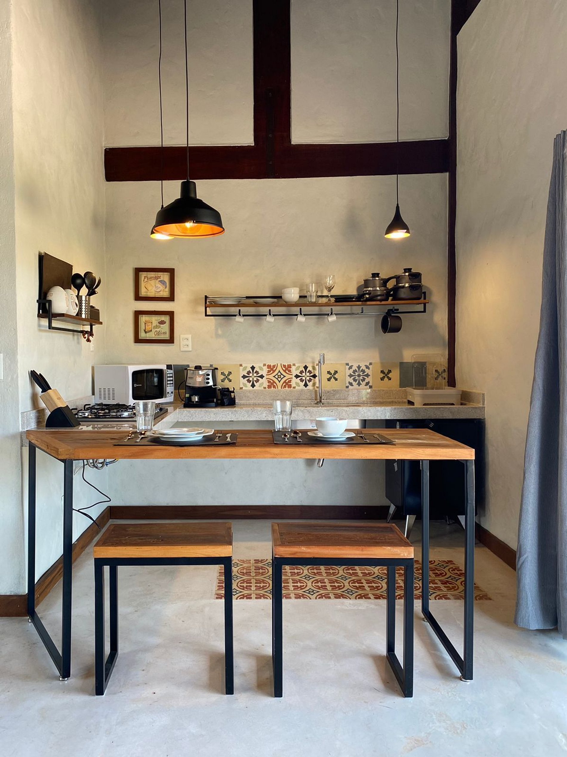 Todas nossas acomodações contam com cozinha equipada para preparar as suas refeições. Caso preferir, é possível encomendar um delicioso café da manhã preparado por uma chef local a base de produtos orgânicos e entregue na porta das acomodações no horário a definir. Importante: precisa ser encomendado com antecipação.